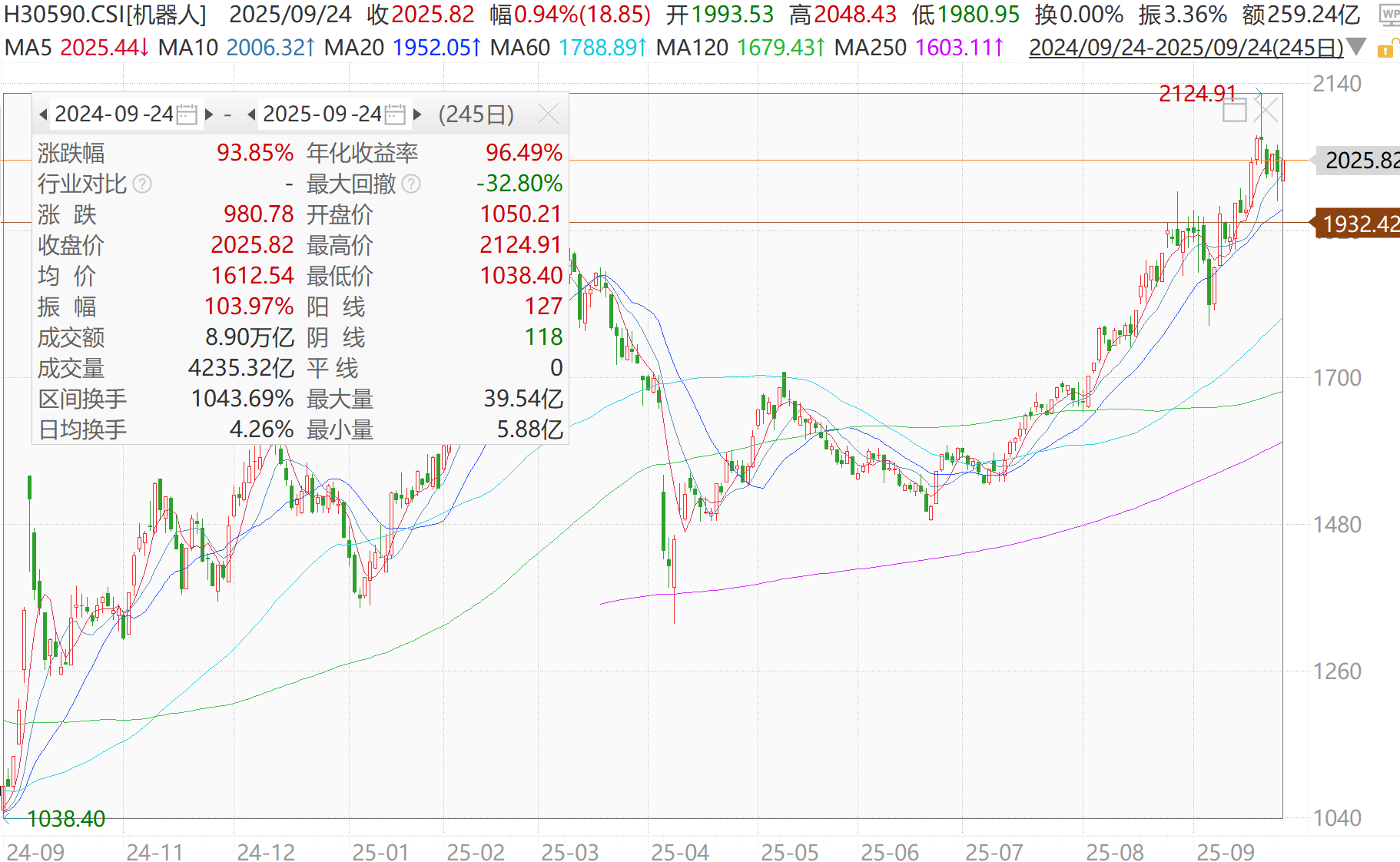自2024年“9.24”行情以来,截至2025年9月24日最新,中证机器人指数的累计涨幅达93.85%,呈现出高弹性、高成长性特征。