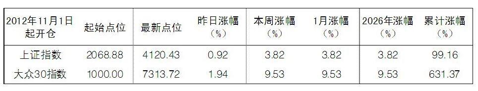 本报综合消息 2026年首周,大盘呈现震荡盘升的走势。上证综指上涨3.82%,深证成指上涨4.40%,创业板指上涨3.89%,大众30指数上涨9.53%。