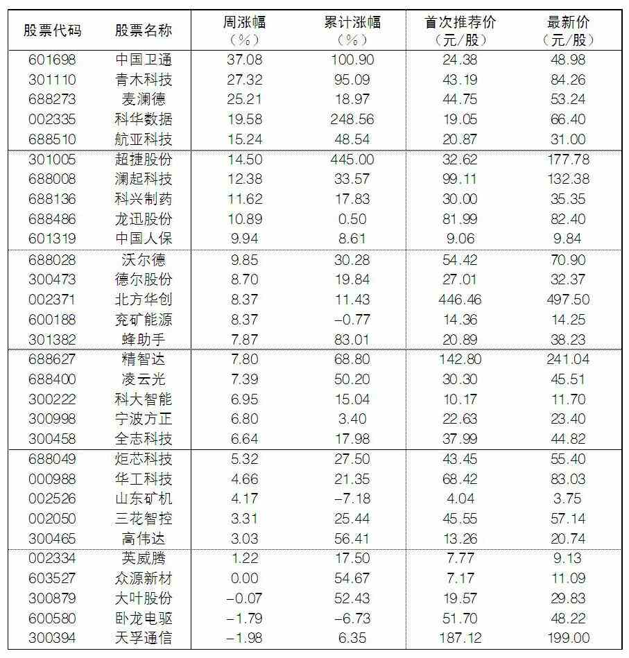 大众30指数成份股中,本周涨幅前五位的分别是中国卫通、青木科技、麦澜德、科华数据、航亚科技,涨幅分别为37.08%、27.32%、25.21%、19.58%和15.24%;跌幅榜上,天孚通信、卧龙电驱、大叶股份等跌幅居前。